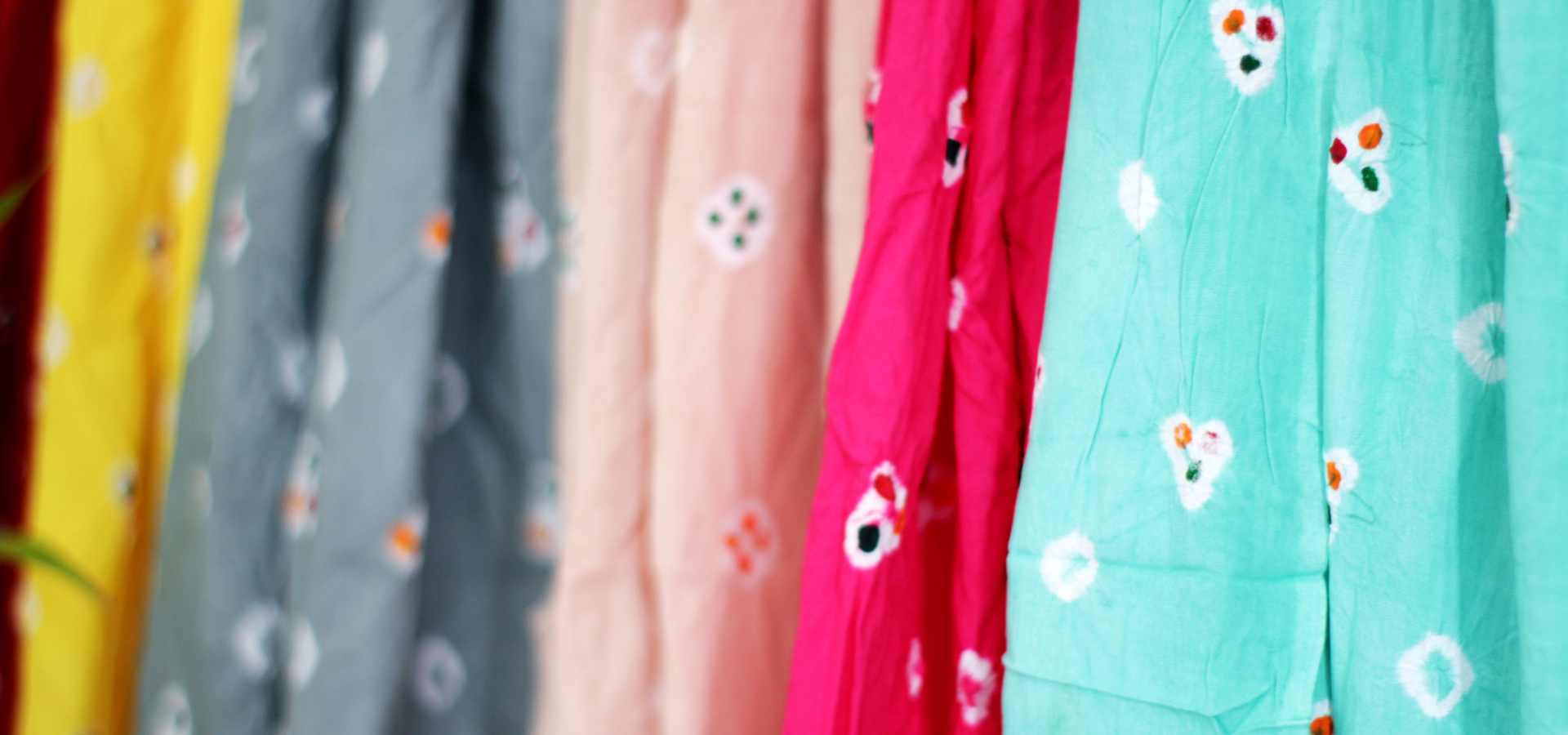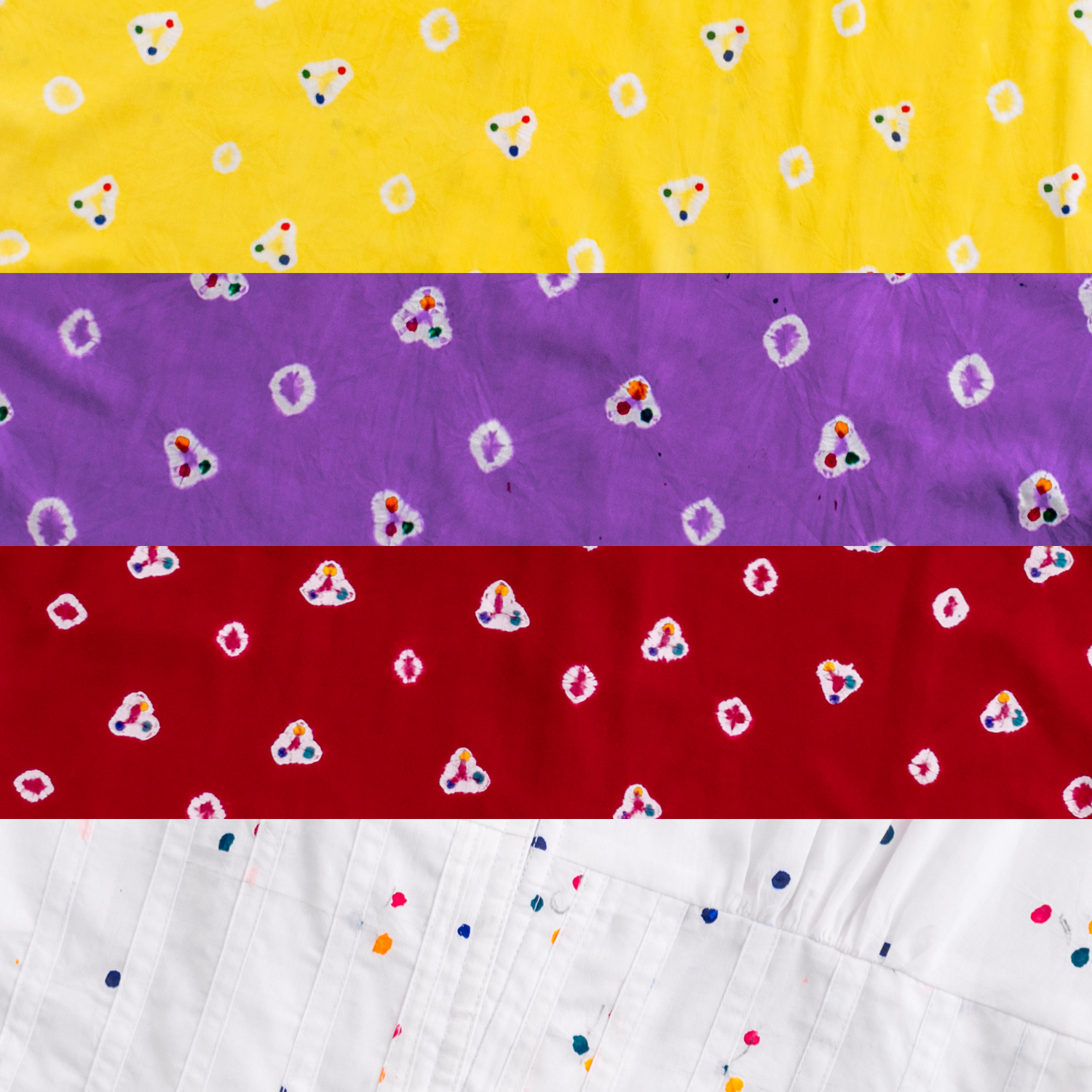 Our Jumputan is made in the city of Surakarta, also known as "Solo", in Central Java. It uses a combined method of tie dye & "tritik" where the artisan isolates parts of the cloth by tying small stones before dipping it in dye & drying. The final step involves painting every dot individually in multiple colours.