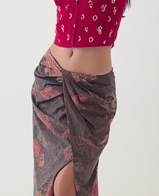 Fit True to size. Draped design with side split, zipped back. NOTE Batik Tulis are hand made so there may be slight (though almost unnoticable) differences in every garment. This only makes each piece more special, and unique.